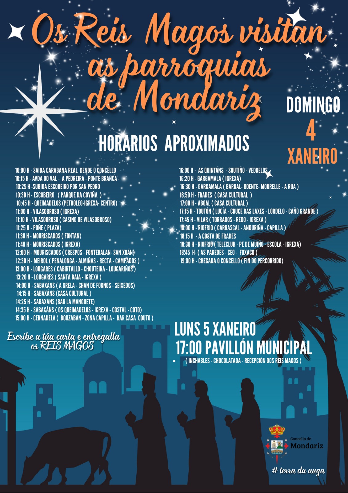 As súas Maxestades os Reis Magos farán a visita por todas as parroquias de Concello de Mondariz para que ningún neno ou nena quede sen entregar a súa carta. No cartel podes consultar o percorrido e horarios.